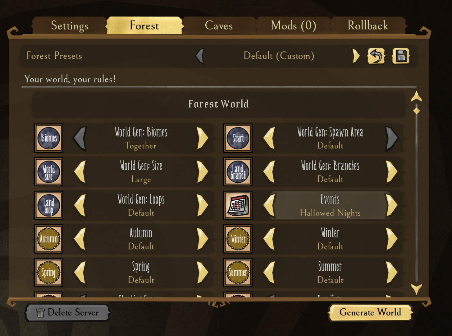 Setting events in the world creation menu.