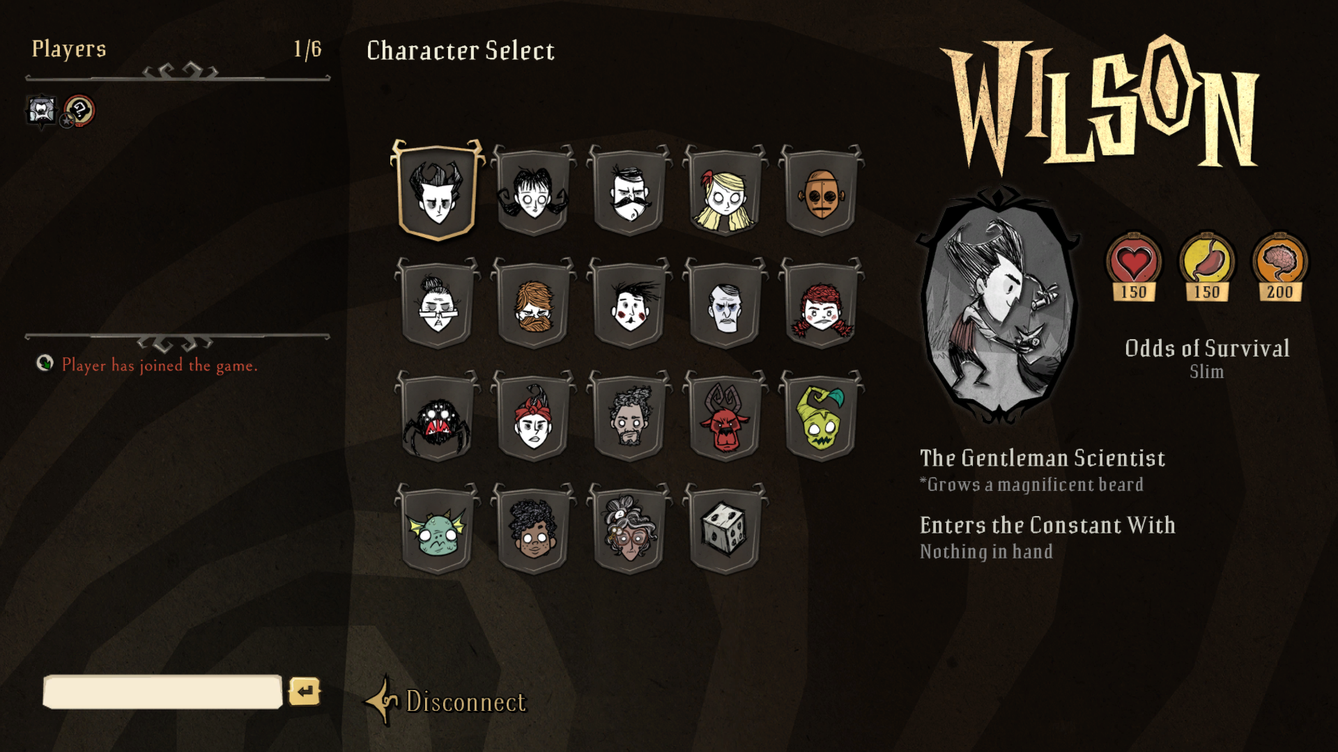 The first accessible Characters are Wilson and Wagstaff, considered the protagonists and the focus of the game's story. Most of the other Characters can be unlocked when sufficient Experience has been accrued, gained at Death or when escaping to a new world. There are currently six Characters that are not unlocked via experience, but through game feats. If the player has not unlocked a Character, they will appear as their respective silhouette. Upon selecting a silhouette, the Poster on the left will be a coffin shut with chains and a lock, and the description will simply say "The Unknown".