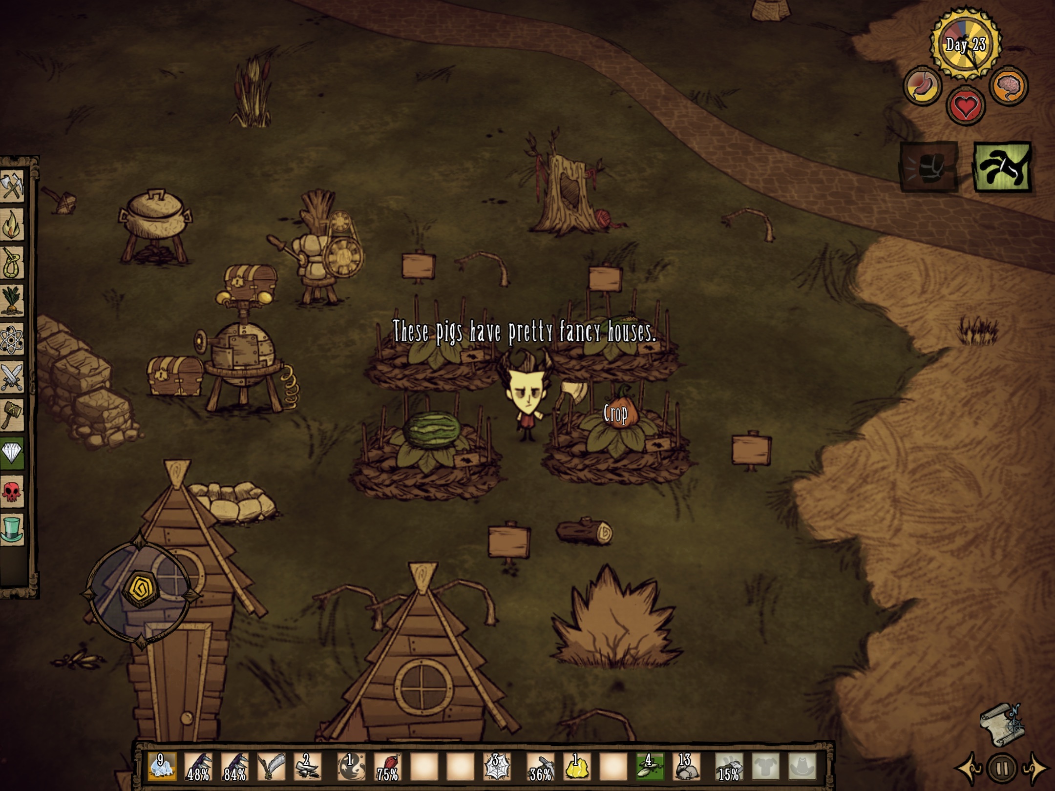 The player may build Pig Houses or Rabbit Hutches around the den to kill stray Spiders, but surviving Pigs will eat Monster Meat on sight (possibly turning into Werepigs) and Bunnymen will attack a player gathering Monster Meat.