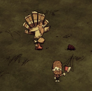 Gobblers are passive Mobs that feed on Berries and all Fruits and Vegetables, including Mandrakes. Gobblers have a 10% chance to appear by leaping out of recently picked Berry Bushes, including underground bushes. Gobblers drop two Drumsticks when killed. Despite being passive, killing Gobblers has no effect on Naughtiness.