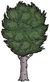 Can be found nearly everywhere. Cut down with the Axe, which drops 1-3 Logs and 1-2 Pine Cones and leaves behind a stump that can be dug up with the Shovel, yielding one extra Log. Occasionally, nearby Trees may turn into Treeguards when a tree is chopped down. |