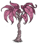 Cave Banana Trees are fruit-bearing plants that can only be found in Ruins. They provide Cave Bananas when picked, and can be chopped down with an Axe to yield two Twigs and one Log. Chopping leaves a stump, which can be dug with a Shovel for an additional Log. Setting the tree on fire, then chopping it will produce 1 Charcoal, whether or not the Cave Banana is still on the tree when burned. Chopped or burned Cave Banana Trees do not respawn, making them a nonrenewable resource in a Cave. |