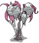 An Eyeplant is an aggressive, stationary mob that spawns from a Lureplant, which will consume or attack anything that gets too close (including unharvested food from Crock Pots, Farms, and Drying Racks; Tooth Traps; and thrown Boomerangs). They will not, however, consume Backpacks or any other container. A single Lureplant is capable of sustaining up to 27 Eyeplants at once, which will generally spawn within a radius of 3 turf tiles. |