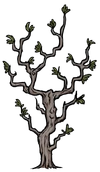 Lumpy Evergreens are a variant of the typical evergreen with lumpy and wilted-looking branches. Unlike normal Evergreens, the Lumpy variety does not produce Pine Cones, leading characters to wonder how it reproduces at all. They still have a life-cycle, growing to huge trees and then reverting to small ones. Also like normal trees, lumpy ones can become Treeguards. |