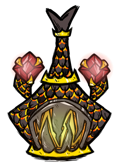 The Scaled Furnace is a craftable Structure exclusive to Don't Starve Together, introduced in A New Reign. It can be found in the Light Sources Filter, Structures Filter and Cooking Filter after the player obtains the Blueprint by either killing the Dragonfly or as a random drop from Loot Stash, after killing Klaus. It can then be crafted using 2 Red Gems, 10 Charcoal and 1 Scales. The Furnace provides heat in a wide radius (which can quickly overheat the player), and light in a very small radius, and allows the player to cook Food. It can also be used to remove items permanently from the world by putting them into one of four slots and pressing "Destroy".