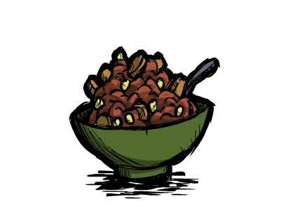 Spicy Chili is a Meat Food Item included in the Reign of Giants DLC. It can be cooked in the Crock Pot by combining 1.5 units of Meats and 1.5 units of Vegetables, except Peppers, which will result in Stuffed Pepper Poppers. No fillers are available for this recipe. It takes 10 seconds to cook and 10 Days to Spoil.