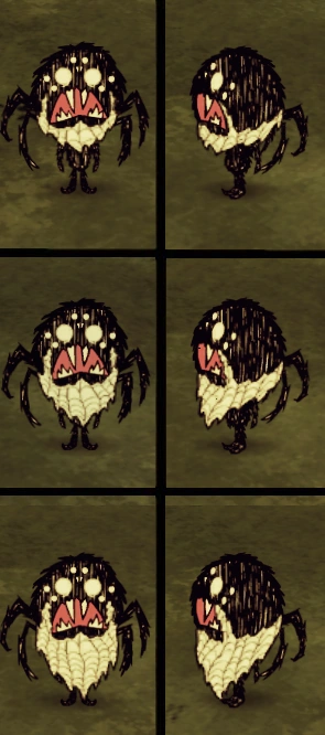 Spiders (including Spider Queens and all forms of Cave spiders) are neutral towards Webber, regarding him as one of their own. Webber does not lose Sanity from being close to spiders. Webber doesn't alarm Spiders when he walks on the sticky webbing around a Spider Den, and his walking speed is not slowed down by it either.