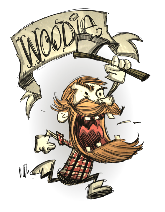 - ↑ Is Woodie Crazy? Klei Forums. Post by Kevin: "Woodie is pretty level-headed most of the time. He's a bit of a lunkhead, because he spends most of his time chopping down trees and not reading books. He's a bit obsessed with wood / trees / chopping, and he has an irrational hatred of birds. Like most Canadians, he apologises a lot.Other than the whole "talks to his axe like it's a person" thing, he's a pretty normal guy." Retrieved on July 7, 2014.
