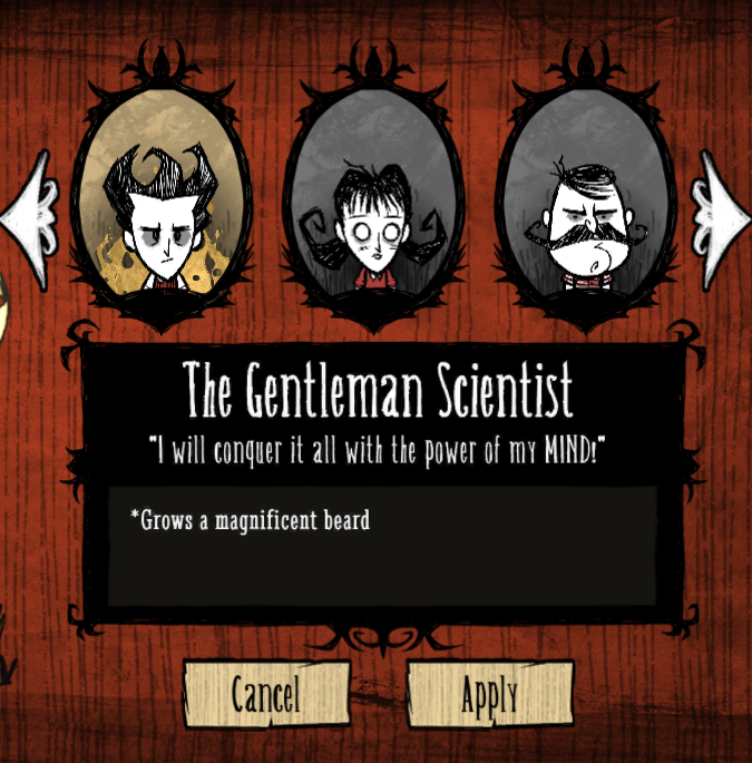 The first accessible Characters are Wilson and Wagstaff, considered the protagonists and the focus of the game's story. Most of the other Characters can be unlocked when sufficient Experience has been accrued, gained at Death or when escaping to a new world. There are currently six Characters that are not unlocked via experience, but through game feats. If the player has not unlocked a Character, they will appear as their respective silhouette. Upon selecting a silhouette, the Poster on the left will be a coffin shut with chains and a lock, and the description will simply say "The Unknown".