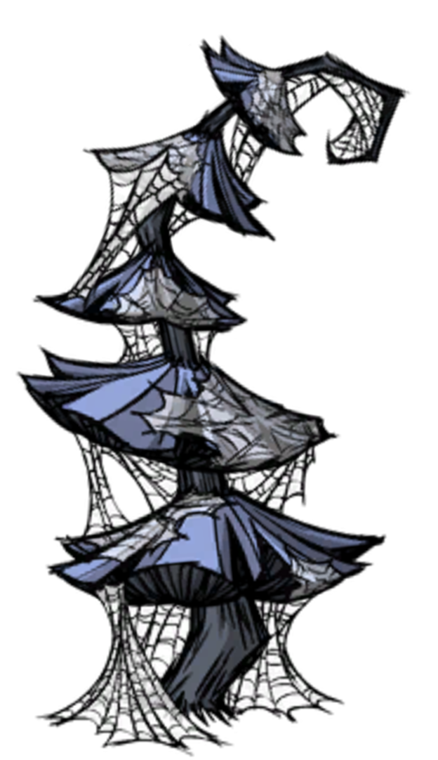 蓝蘑菇树的一种变种,名为 蛛网蓝蘑菇树,可以在 穴居悬蛛 的巢穴附近找到。每个巢穴会以每天1棵的速度感染周围的蓝蘑菇树,最多感染6棵。用斧头砍伐蛛网蓝蘑菇树时,会在附近的巢穴中生成蜘蛛。 值得注意的是,即使你使用的是 韦伯 ,在砍伐掉这种特殊的蘑菇树变种后,穴居悬蛛也会毫不犹豫地攻击你。